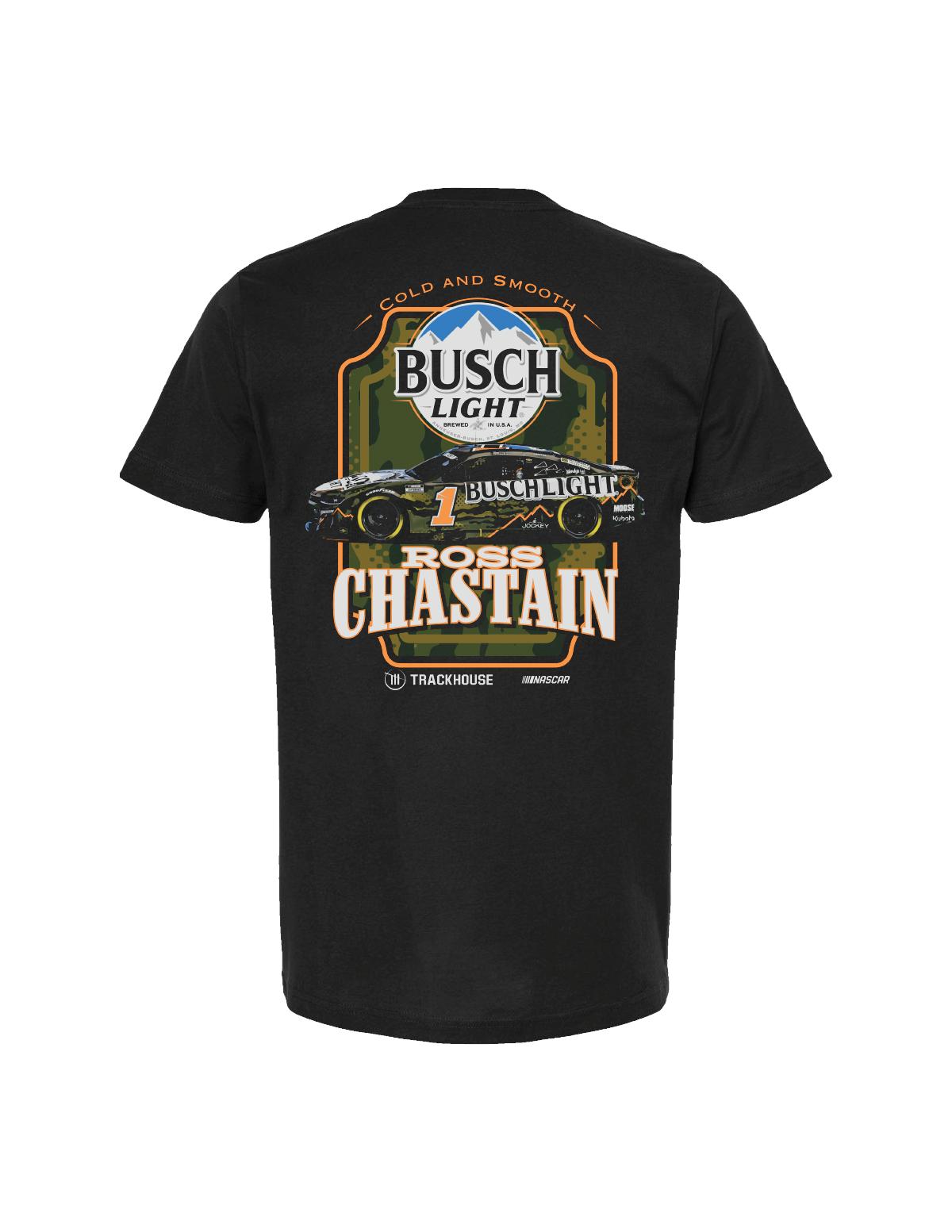 Show your support for Ross Chastain with this officially licensed Busch Light Camo tee. Featuring a bold Busch Light logo on the chest and a full back design with the #1 Busch Light Chevrolet, this shirt blends racing passion with a rugged camo style.